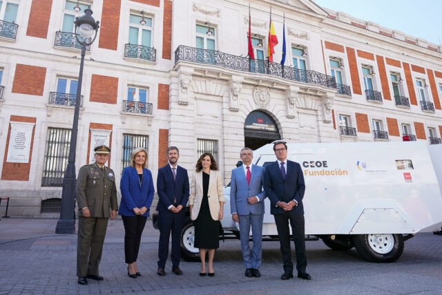 La Fundación CEOE, en colaboración con la Embajada de Ucrania y la Comunidad de Madrid, han celebrado hoy en la Puerta del Sol un acto simbólico para presentar un vehículo sanitario blindado y totalmente equipado que tendrá como destino Ucrania, para colaborar en la asistencia social y la ayuda humanitaria a las víctimas del conflicto que sufre el país por la invasión rusa de febrero de 2022.